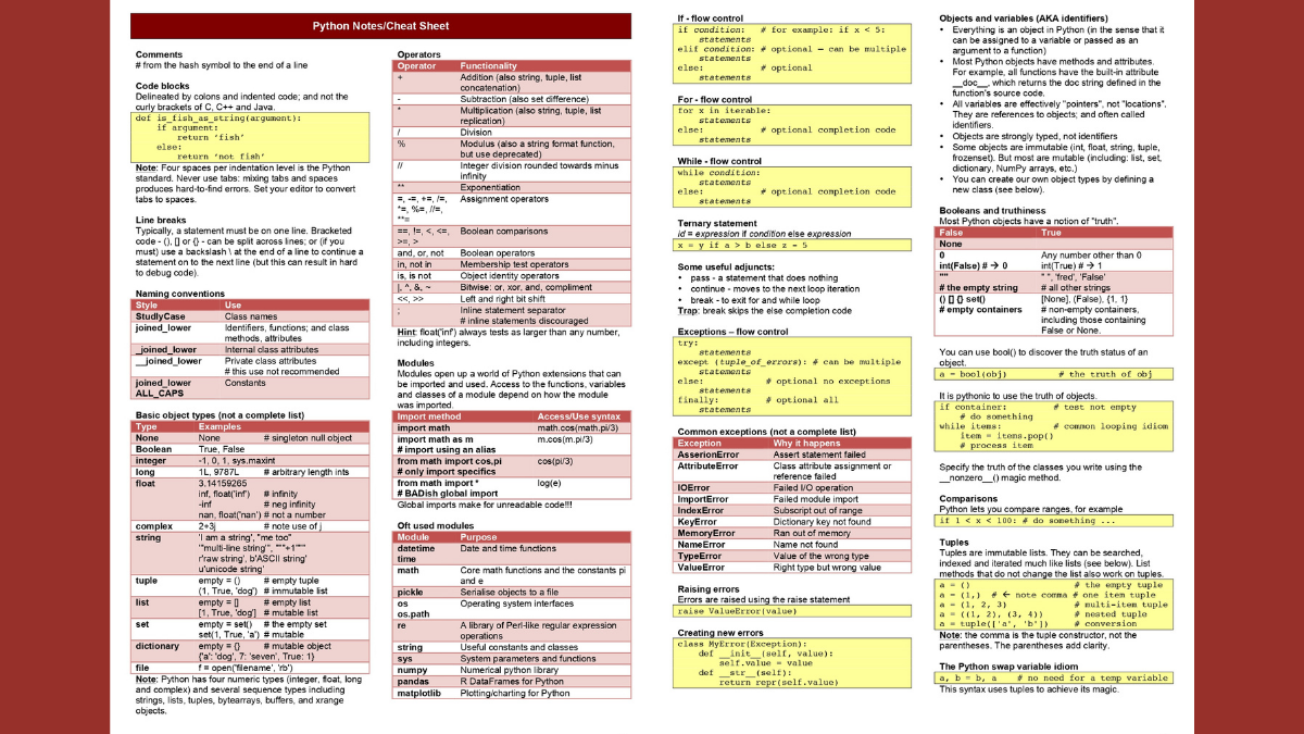 The Python Notes Cheat Sheet serves as an invaluable resource for both beginners and experienced Python programmers. Whether you’re learning the language or working on a complex project, this comprehensive guide will save you time and effort by providing quick access to essential Python concepts, syntax, and functions. By having a condensed version of the language’s core features at your fingertips, you can focus on writing efficient and elegant code.